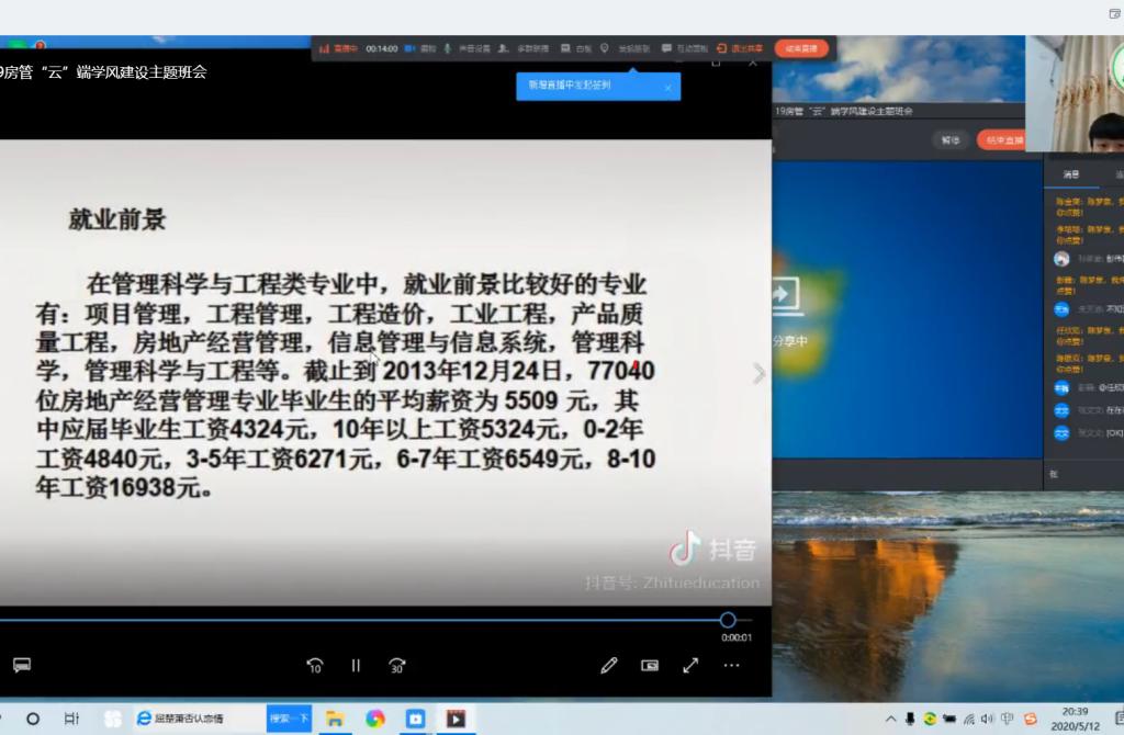 习近平寄语新时代青年强调:新时代中国青年要继承和发扬五四精神,坚定理想信念站稳人民立场,练就过硬本领投身强国伟业,始终保持艰苦奋斗的前进姿态,同亿万人民一道,在实现中华民族伟大复兴中国梦的新长征路上奋勇搏击。为了贯彻落实习总书记的指示精神,提高同学们的学习热情和学习积极性,加强班级学风建设,公司开展“云”端学风建设月活动,19房地产开发与管理专业积极参与,并举行了一系列主题活动。