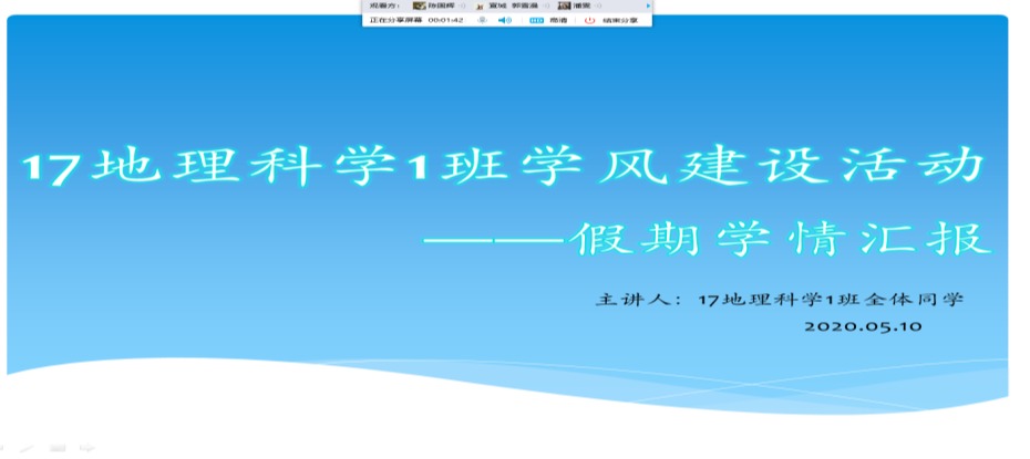 活动中,同学们积极踊跃发言,主动和大家交流分享自己在疫情期间的学习和生活情况,也分享了自己作为大三员工对未来道路的规划和未来做的准备工作。在课余时间,部分同学借助一些线上平台,实现居家云自习、云打卡、云阅读、云旅游等。同学们“停课不停学”的拼搏努力,不仅延续了地理科学专业的优良学风传统,更激励了部分有所懈怠的同学提高学习兴趣认真规划好人生。同时通过活动,同学间彼此拉近距离,互相鼓励同伴提高自己的学习热情和效率。