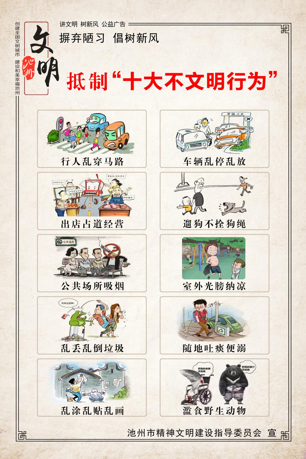 十大不文明行为包括:一、行人乱传马路;二、车辆乱停乱放;三、出店占道经营;四、遛狗不栓狗绳;五、公共场所吸烟;六、室外光膀纳凉;七、乱丢乱倒垃圾;八、随地吐痰便溺;九、乱涂乱贴乱画;十、滥食野生动物。城市是一个大家庭,需要每一个人的共同努力、共同建设。