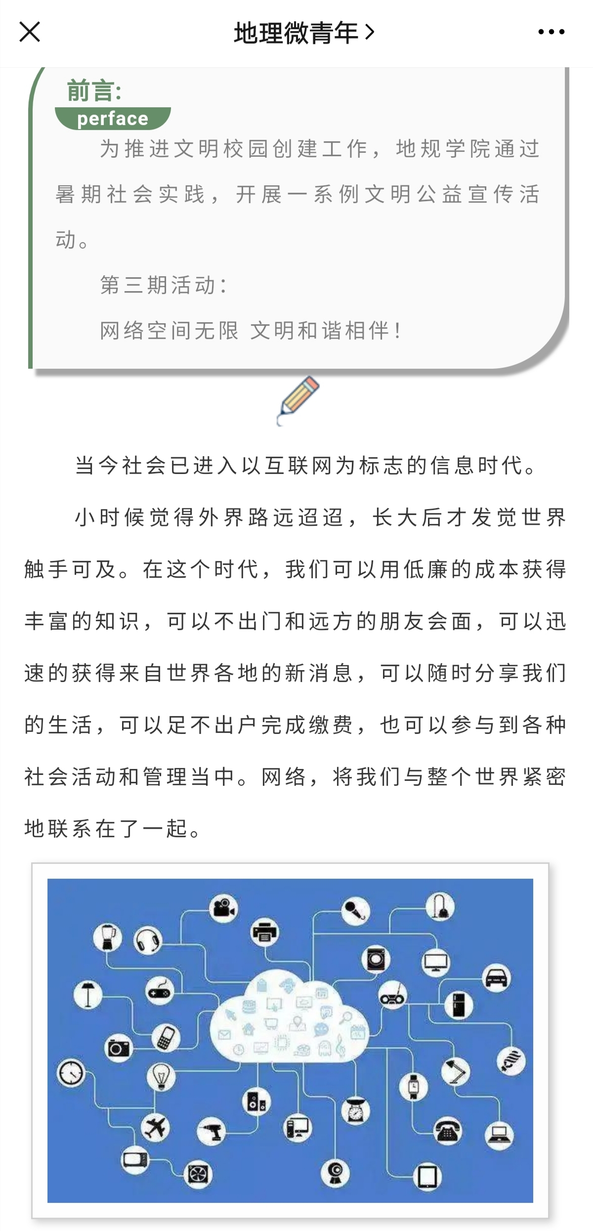 为推进文明校园创建工作,营造绿色文明的网络空间,太阳成集团122ccvip2020年暑期第三期文明公益活动主题以“网络空间无限,文明和谐相伴”进行开展。