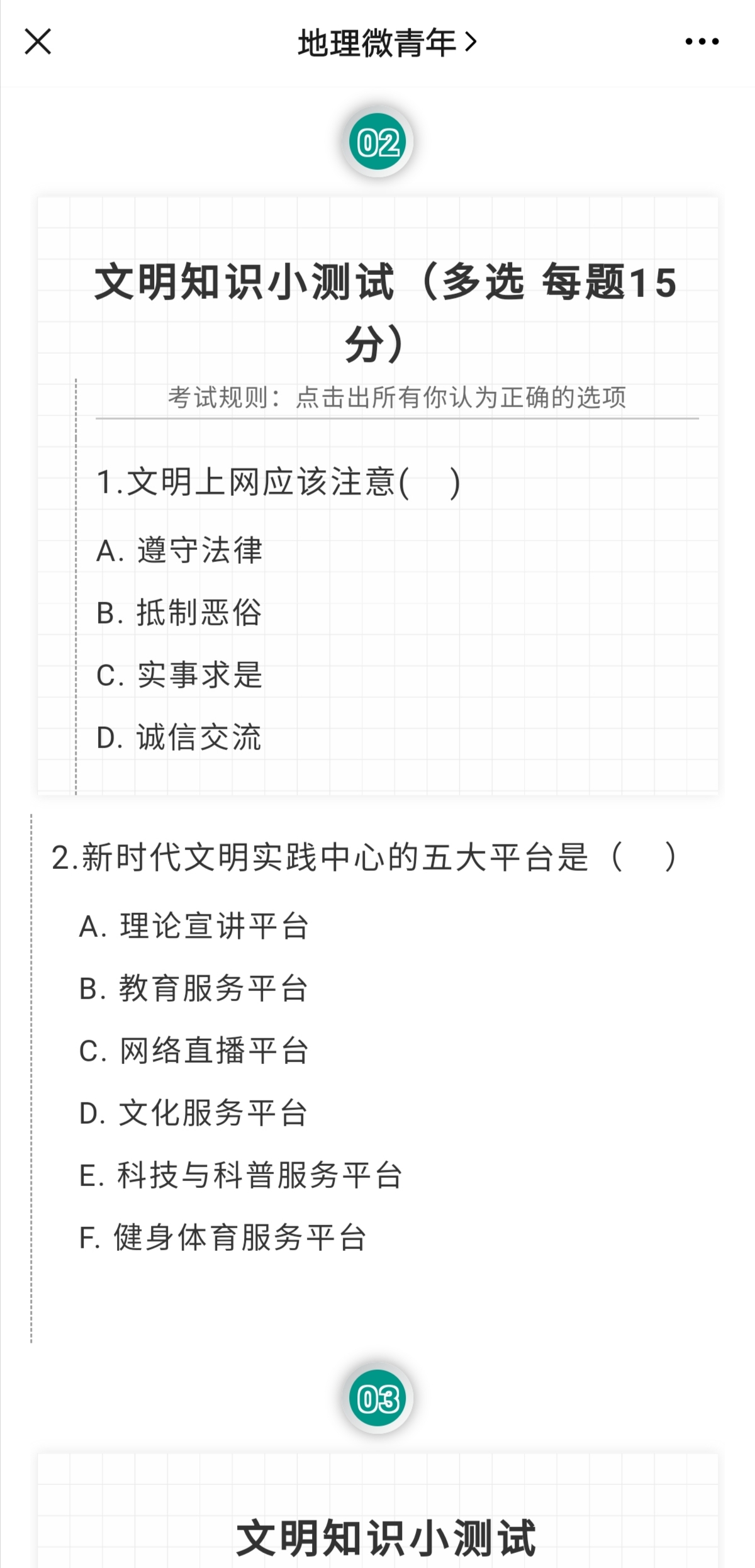 本次活动开展了一次有趣的文明知识小测试,测试题分为单选与多选题,旨在通过活动提升更多群体对创建文明重要性的认识,扩大群众对文明创建的知晓率、参与率和满意率,倡导更多人从身边小事做起,告别陈规陋习,树立文明新风,他创建文明校园、文明城市,以及和庇美丽的家园贡献力量。