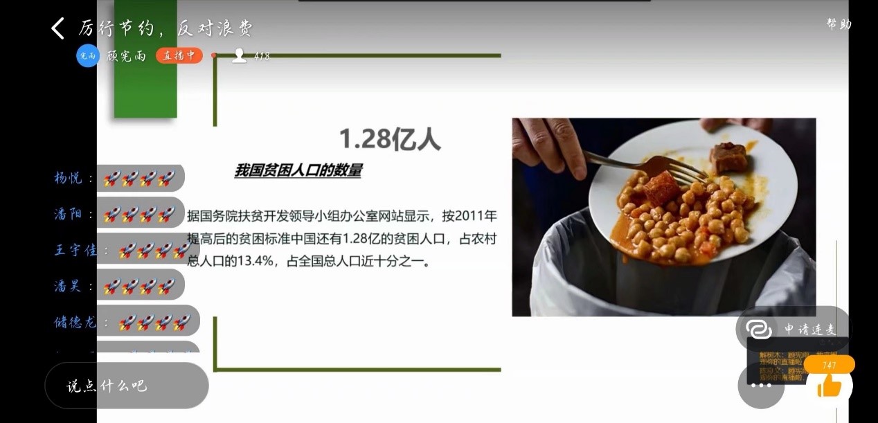 公司员工代表顾宪雨同学结合自身实际,分享自身所思所感,分别在9月14日和9月19日面向公司新老生同学,开展了“厉行节约,反对浪费”线上主题宣讲。顾宪雨以节约纸、粮食、水三种资源为例,通过分享自身生活经历的方式,向公司员工讲述了她在日常生活中所见到的资源获取的不易、资源浪费的严重性以及资源节约的重要性,号召大家重视资源节约,厉行资源节约。