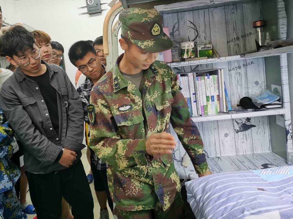 教官在辅导员的带领下,到各个寝室进行宿舍整理示范,从生活用品的摆放到寝室的总体布局,从整理床铺到洗衣叠被,教官一一示范。新生在整理内务中表现得积极主动,认真观摩,仔细观察教官在整理时的动作,并积极改正自己在整理时出现的错误。在教官的带领指导下,不成形的被子变成了有棱有角的 “豆腐块”,凌乱不堪的宿舍变得干净整洁,整个宿舍焕然一新。