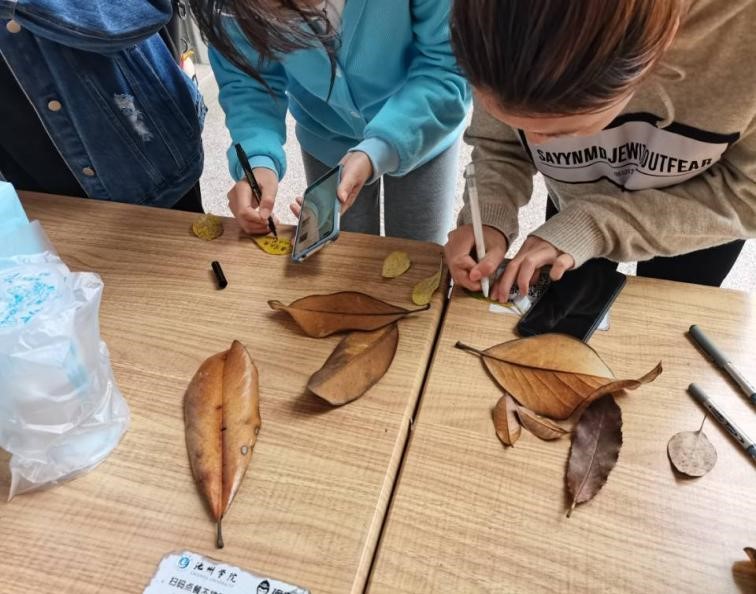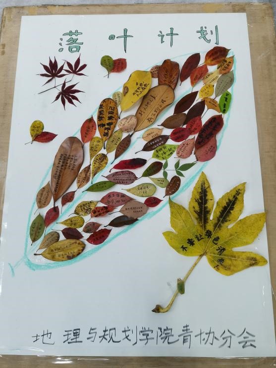 活动结束后青协人员将一部分精美落叶制作为海报在博文楼前进行宣传展示。