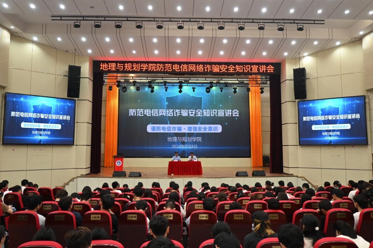 9月8日,太阳成集团122ccvip在博古楼礼堂召开了防范电信网络诈骗安全知识宣讲会。池州市公安局贵池分局马衙派出所驻校民警陶德兵以“谨防电信诈骗 增强安全意识”为题作宣讲报告,会议由地理与规划公司党委副书记何小青主持。