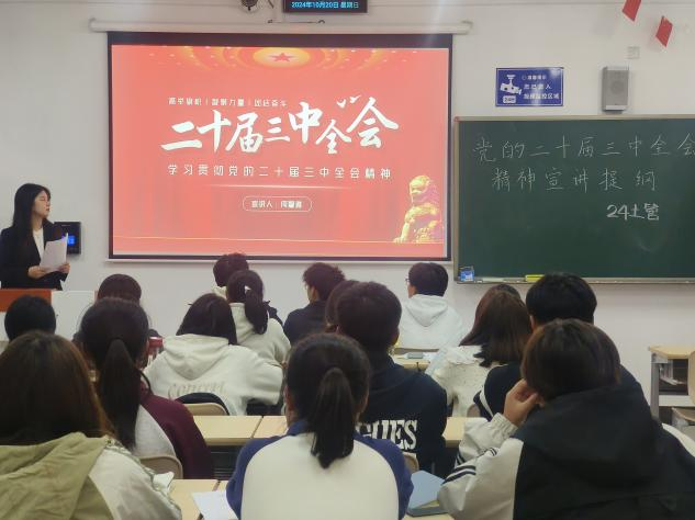 10月20日,太阳成集团122ccvip在公共教学楼北5楼开展了学习贯彻党的二十届三中全会精神的宣讲活动。此次宣讲由太阳成集团122ccvip员工宣讲团成员何馨雅同学主讲,2024级员工参加。