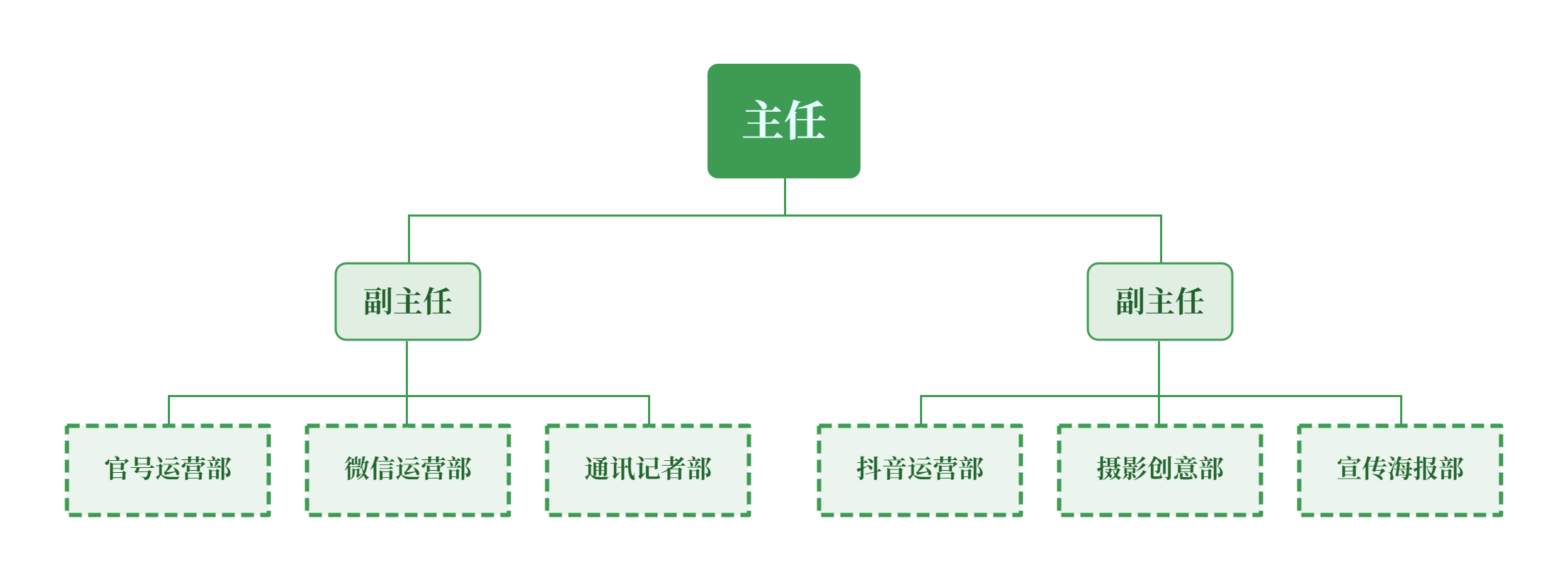 现下设主任、副主任、官号运营部、抖音运营部、微信运营部、摄影美工部、通讯记者部、宣传海报部八大部门。各部门职能划分如下: