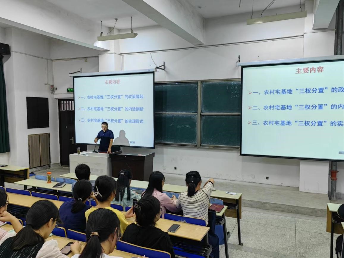 张勇以宅基地“三权分置”为主题,分析了宅基地所有权、资格权、使用权分置的理论意义和现实必要性,分享了新一轮宅基地变革探索中各种模式。并结合池州市东至县宅改的创新,鼓励同学们要将理论学习和实践调研相结合,将自己的青春谱写在祖国的大地上。