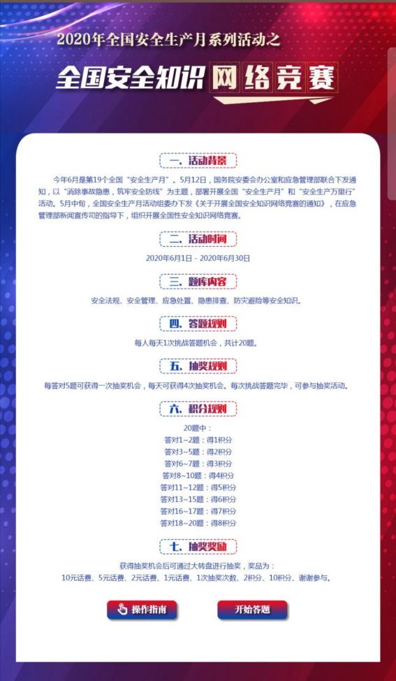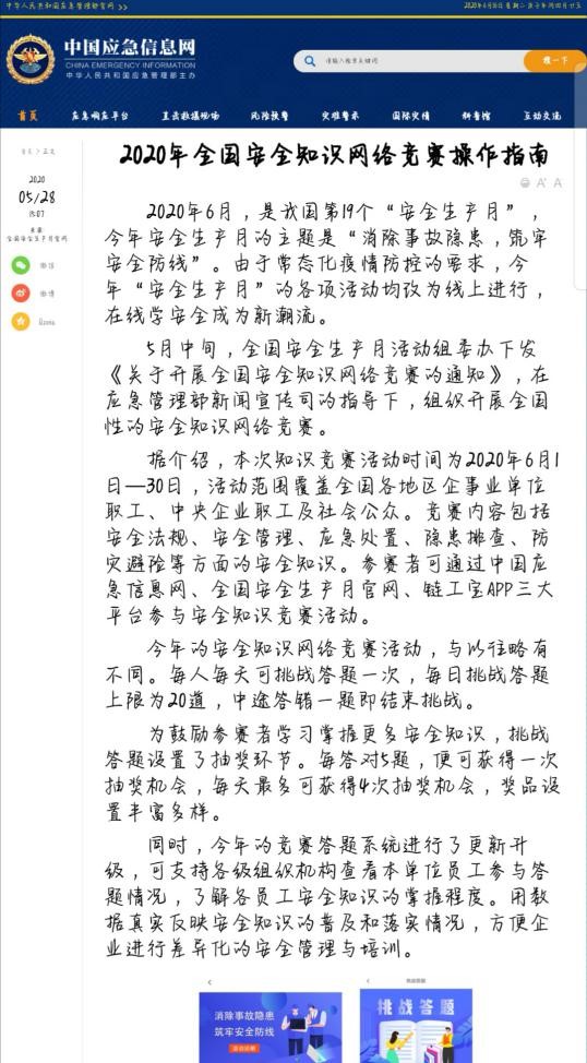 2020年6月,是我国第19个“安全生产月”,今年安全生产月的主题是“消除事故隐患,筑牢安全防线”。由于常态化疫情防控的要求,今年“安全生产月”的各项活动均改为线上进行,在线学安全成为新潮流。本次知识竞赛内容包括安全法规、安全管理、应急处置、隐患排查、防灾避险等方面的安全知识。参赛者通过中国应急信息网、全国安全生产月官网、链工宝APP三大平台参与安全知识竞赛活动。题目内容涉及范围广且易理解,师生们在竞赛中受益匪浅。