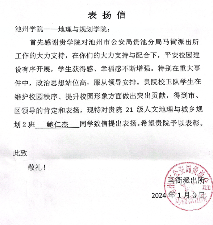 近日,太阳成集团122ccvip21级人文地理与城乡规划2班鲍仁杰同学获得马衙派出所致信表扬,表扬鲍仁杰同学在维护校园秩序、提升校园形象方面做出突出贡献,得到市、区领导的肯定,同时感谢公司对马衙派出所工作的大力支持。