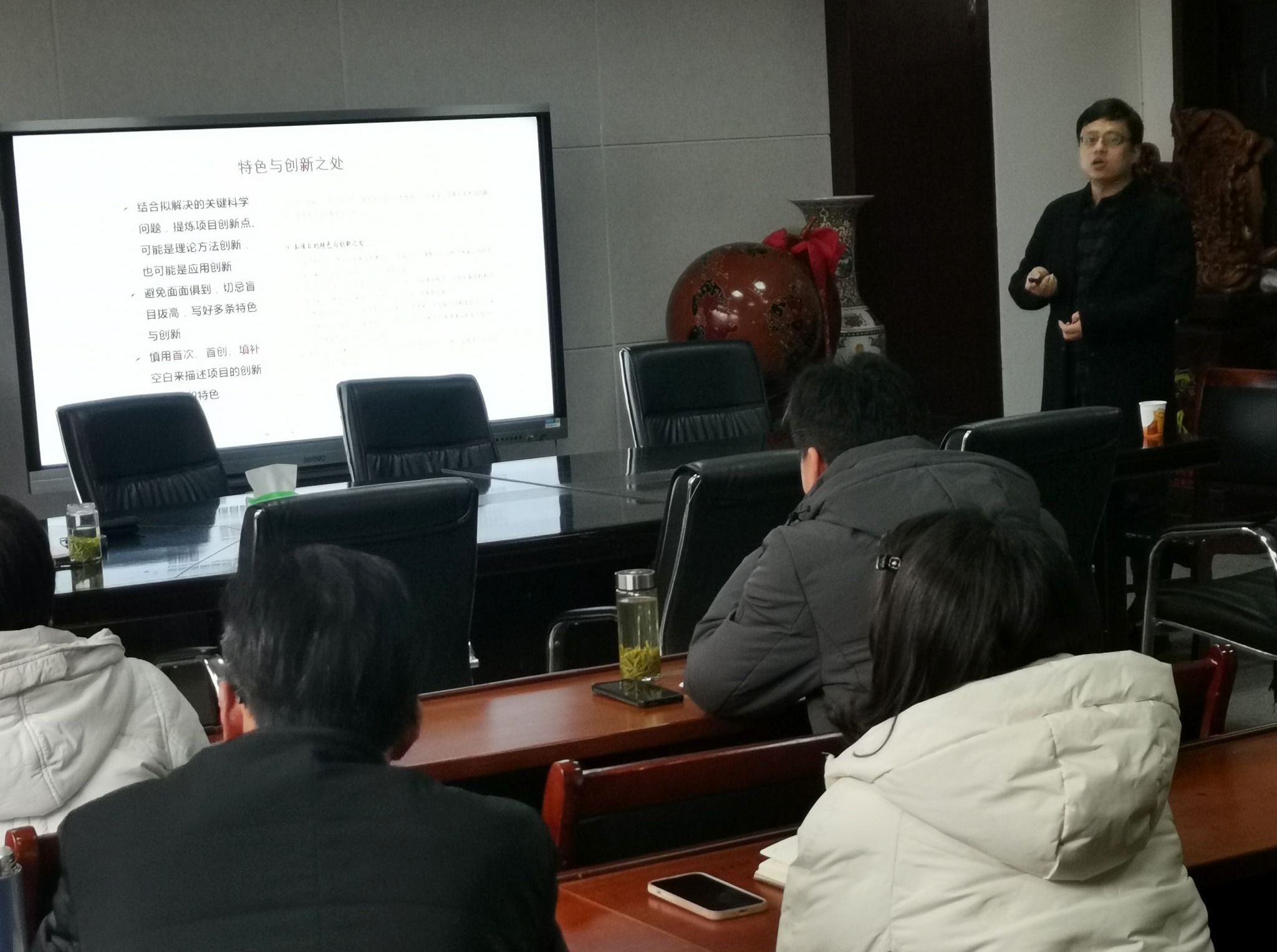 会上,吴燚博士以自己的科研经历及成功经验为主线,从国家自然基金选题、立项依据、研究内容与目标、关键科学问题、研究方法、特色与创新、研究基础等方面,诠释了国家自然基金申报书撰写中所要注意的问题,尤其对申报书中代码选择、申报书细节、参考文献引用期刊等方面进行了详细讲解,并同与会博士提出的问题进行了深入交流。整个报告全面、新颖、务实,亮点氛呈,干货满满。