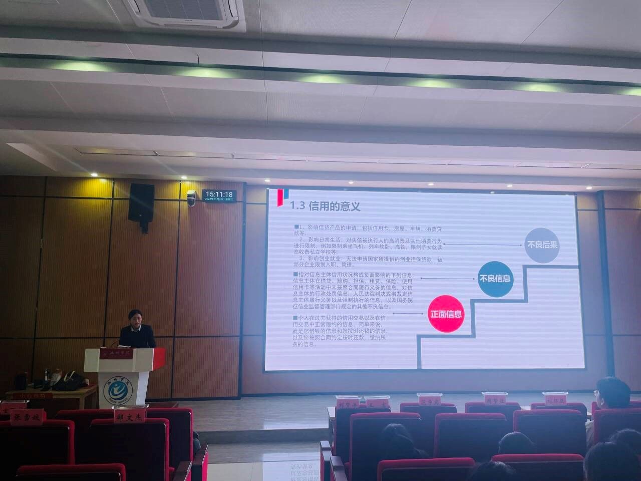 活动中,肖娅以“珍爱信用记录,共筑诚信金融”为主题进行征信宣讲。她结合实际案例,深入浅出地讲解了个人征信的概念、重要意义及作用,内容丰富、详实。她强调良好的个人信用记录是在金融领域立足的重要基础,特别提醒同学们要树立正确的消费观念,远离非法校园贷,珍惜个人信用记录,避免因金融风险而影响学业和未来发展。