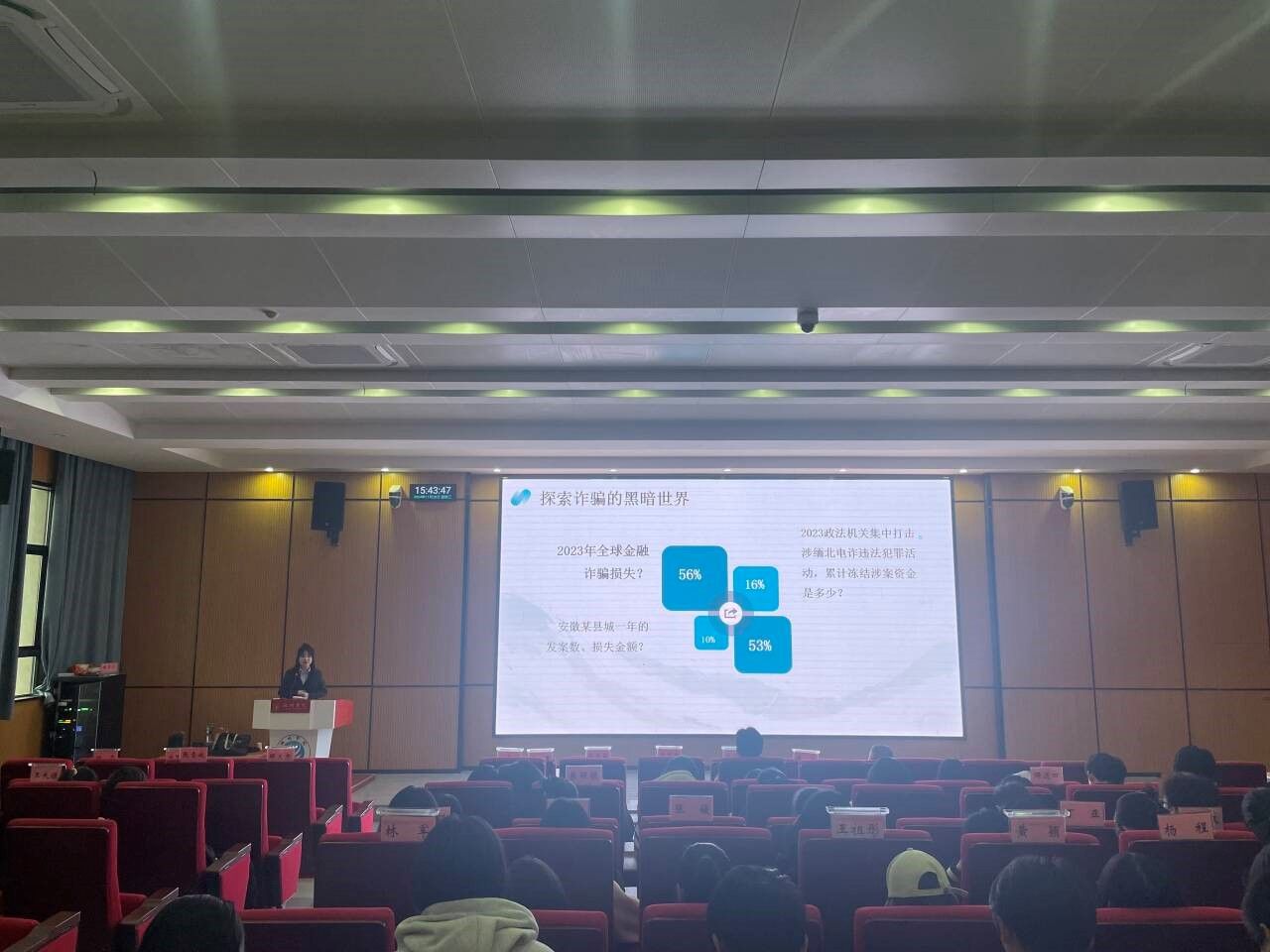 随后,胡慧妍以“智青春,让诈骗终将逝去”为主题进行反诈宣讲。她通过生动形象的案例分析和互动问答环节,向同学们详细讲解了金融诈骗的常见手段、网络借贷的风险与陷阱等,让同学们对金融安全知识有了更深入的了解,提高了自身的风险防范意识和金融素养。