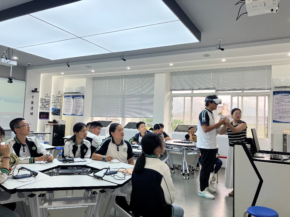 在实验室老师的引导下,师生们依次体验了地表过程实验室、天文气象实验室和数字地理体验室。通过操控月相仪,员工可实时观察到不同时间的月相变化;借助数字地理沙盘,员工通过手动改造沙盘地形(如堆砌山峰、挖掘河道),即时观察等高线变化,激发了同学们的科学探究精神。最令师生们震撼的数字地理体验室,戴上VR设备后,同学们“穿越”到九华山地质剖面内部,直观观察花岗岩垂直节理发育过程。