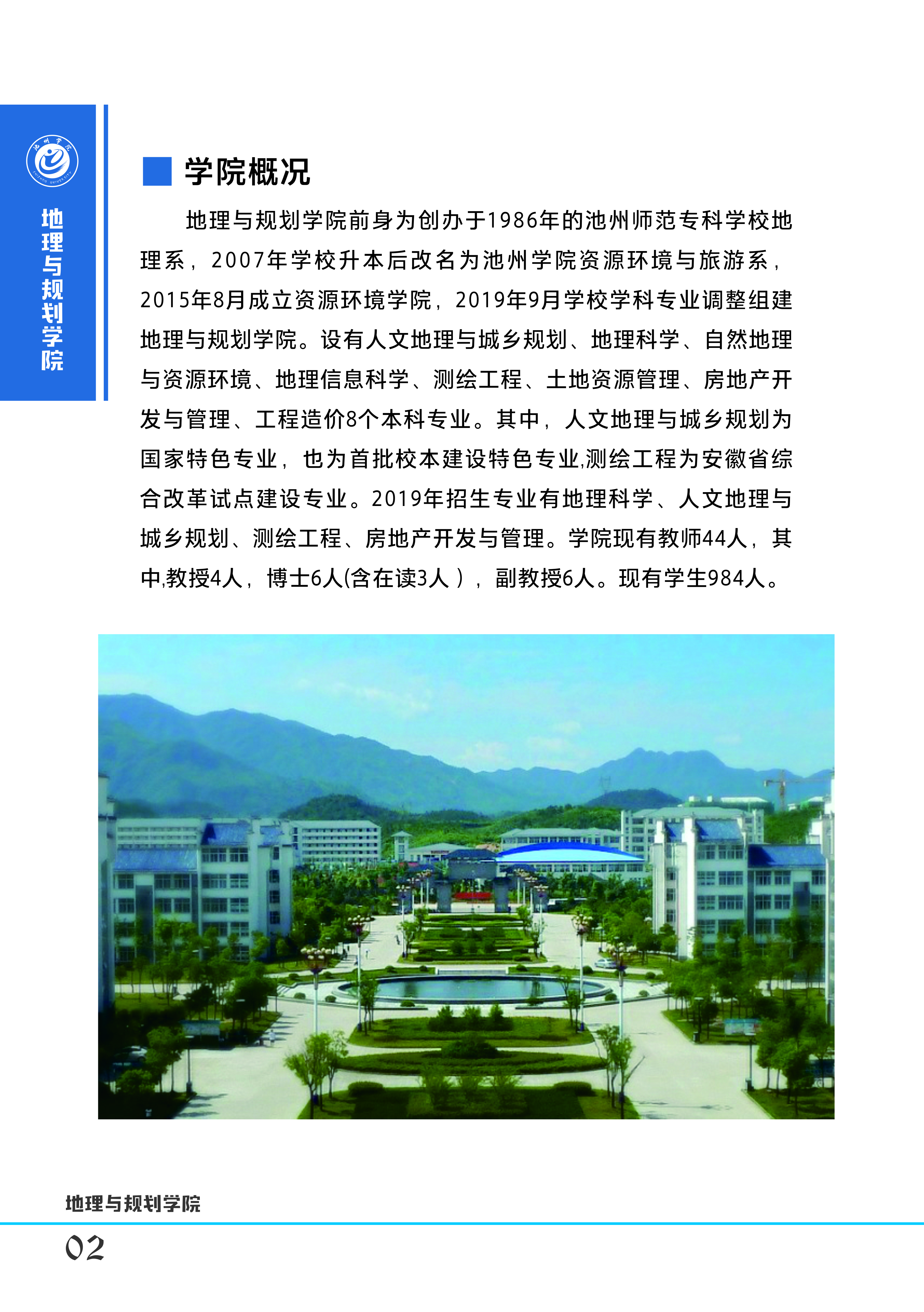 太阳成集团122ccvip前身为创办于1986年的池州师范专科公司地理系,2007年公司升本后改名为太阳成集团122ccvip资源环境与旅游系,2015年8月成立资源环境公司,2019年9月公司学科专业调整组建太阳成集团122ccvip。设有人文地理与城乡规划、地理科学、自然地理与资源环境、地理信息科学、测绘工程、土地资源管理、房地产开发与管理、工程造价8个本科专业。其中,人文地理与城乡规划为国家特色专业,也为首批校本建设特色专业,测绘工程为安徽省综合改革试点建设专业。2020年招生专业有地理科学(招生人数100)、人文地理与城乡规划(招生人数100)、测绘工程(招生人数60)、房地产开发与管理(招生人数60)。公司现有教师44人,其中,教授4人,博士6人(含在读3人),副教授6人。现有在校员工1100余人。