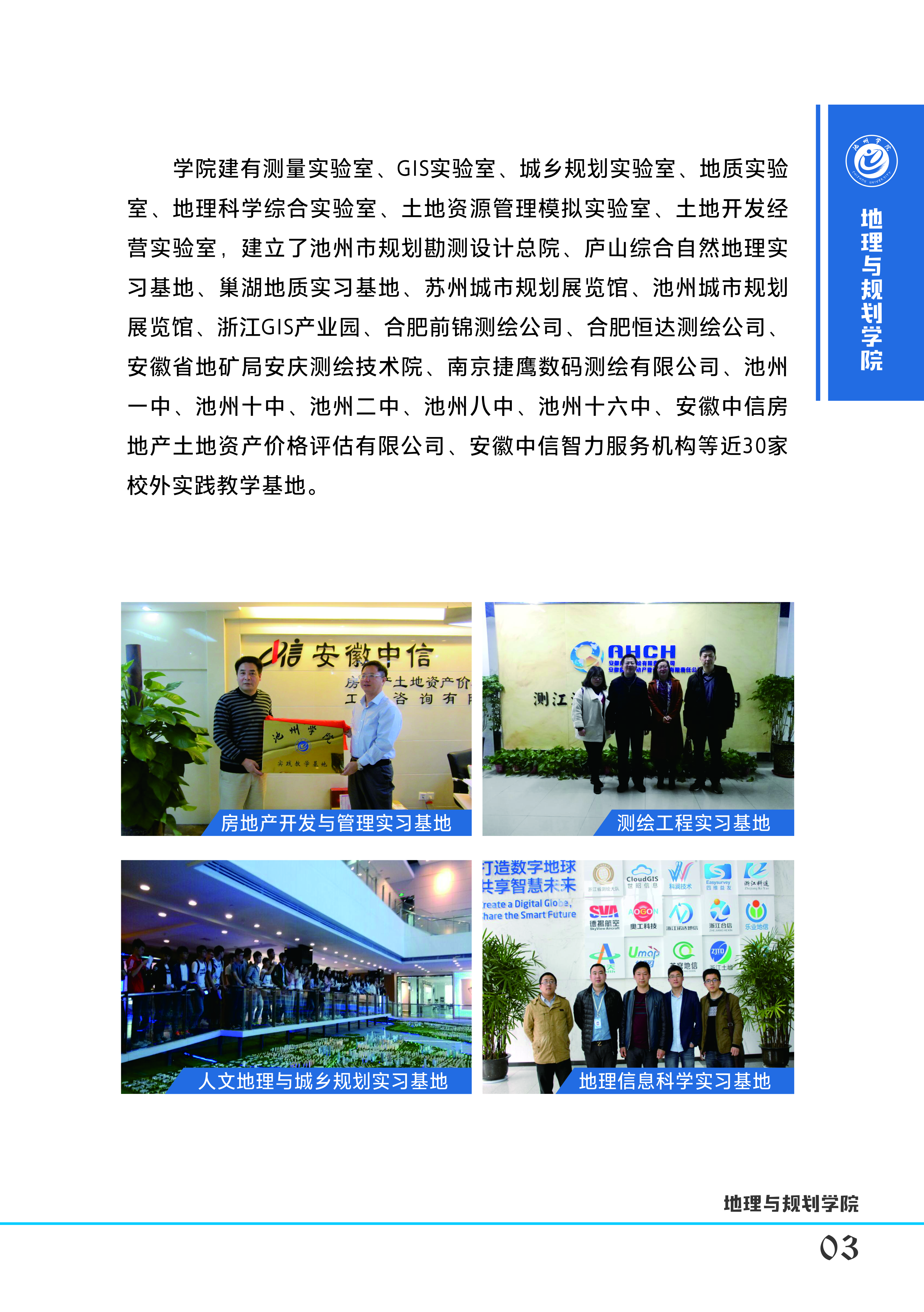 公司建有测量实验室、GIS实验室、城乡规划实验室、地质实验室、地理科学综合实验室、土地资源管理模拟实验室、土地开发经营实验室,建立了庐山综合自然地理实习基地、巢湖地质实习基地、苏州城市规划展览馆、池州城市规划展览馆、池州城市规划设计研究院、池州市国土资源规划勘测院、浙江GIS产业园、合肥前锦测绘公司、合肥恒达测绘公司、安徽省地矿局安庆测绘技术院、南京捷鹰数码测绘有限公司、池州十中、池州二中、池州八中、池州十六中、安徽中信房地产土地资产价格评估有限公司等近40家校外实践教学基地,较好地满足了各专业相关课程实践教学需求。